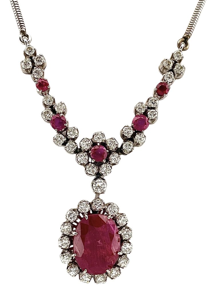 Collana vintage oro 18kt gr 16.95 con rubini 5.70 ct e diamanti 1.60 ct.