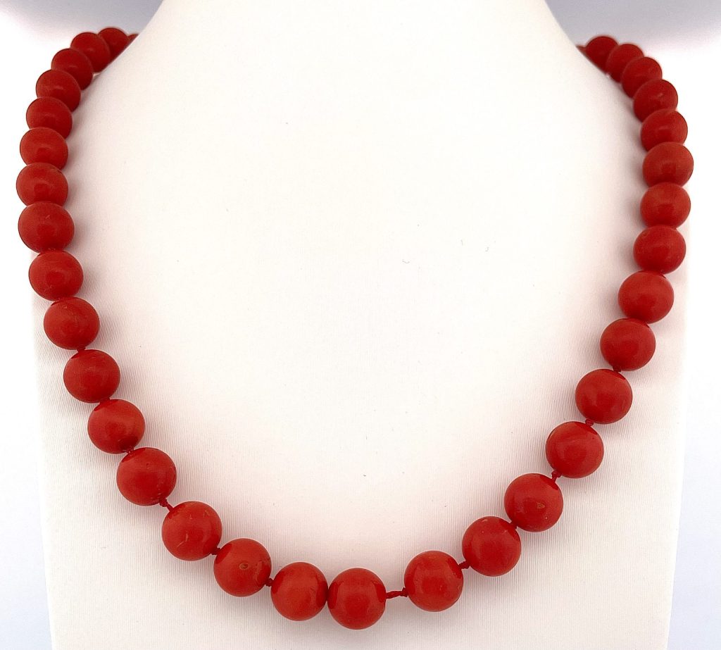Collana corallo naturale gr 52.50 da 9mm a 6.5mm in oro 18 kt.