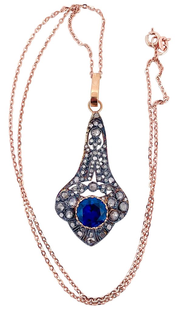 Collana pendente in stile antico con zaffiro Verneuil e diamanti.