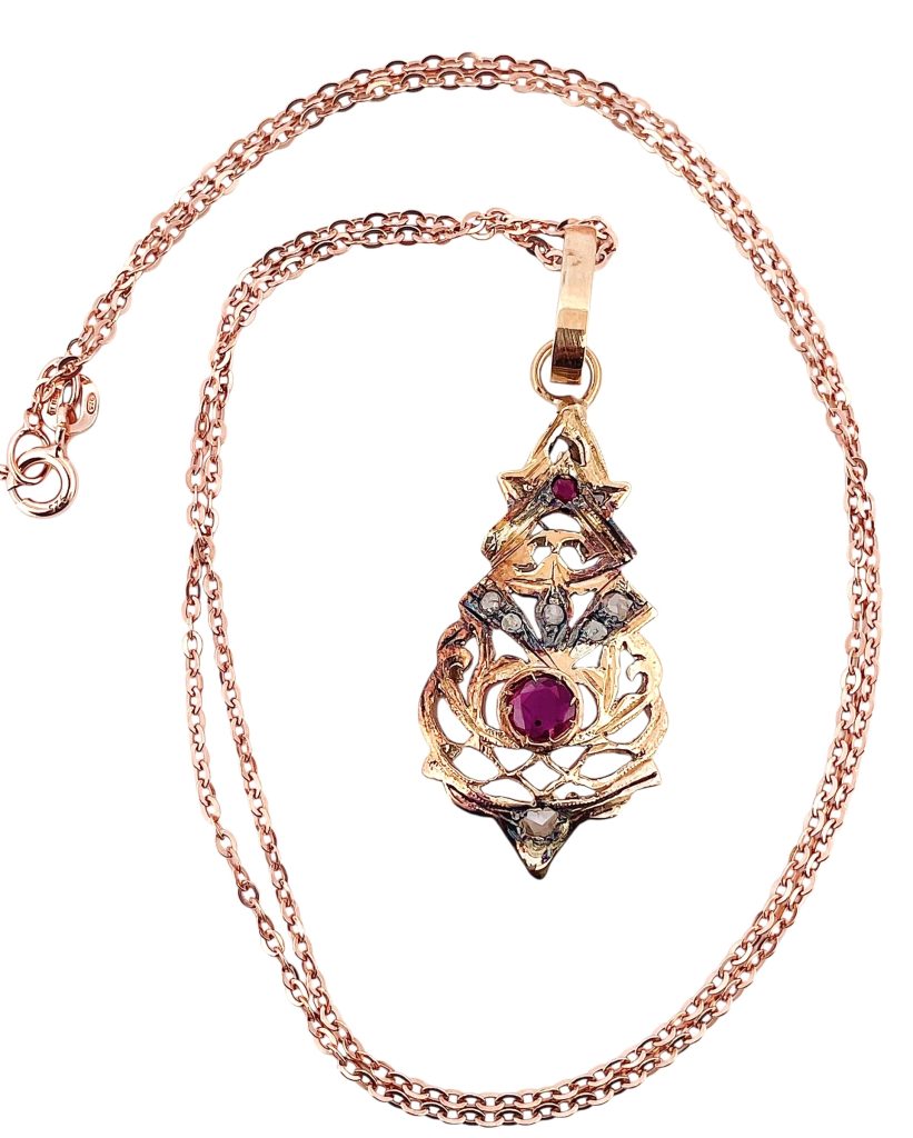 Collana pendente in stile antico Art Noveau con rubini naturali e diamanti.