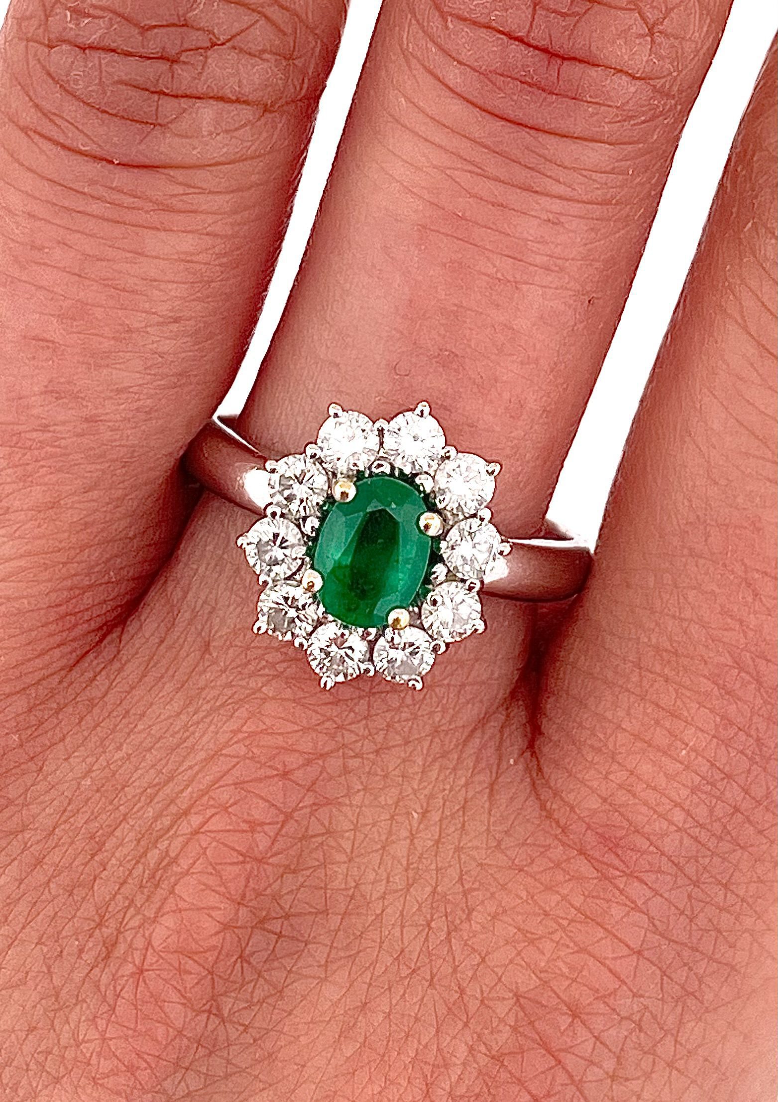 Anello in oro bianco 18kt. Oggetto di eccellente manifattura fine ed elegante. Presenta uno smeraldo naturale in taglio ovale per 1.00 ct stimati. 10 diamanti naturali in taglio rotondo a brillante per 1,00ct stimati totali H/l color VS/SI stimati. Grammi: 6,24. Misura italiana: 19.